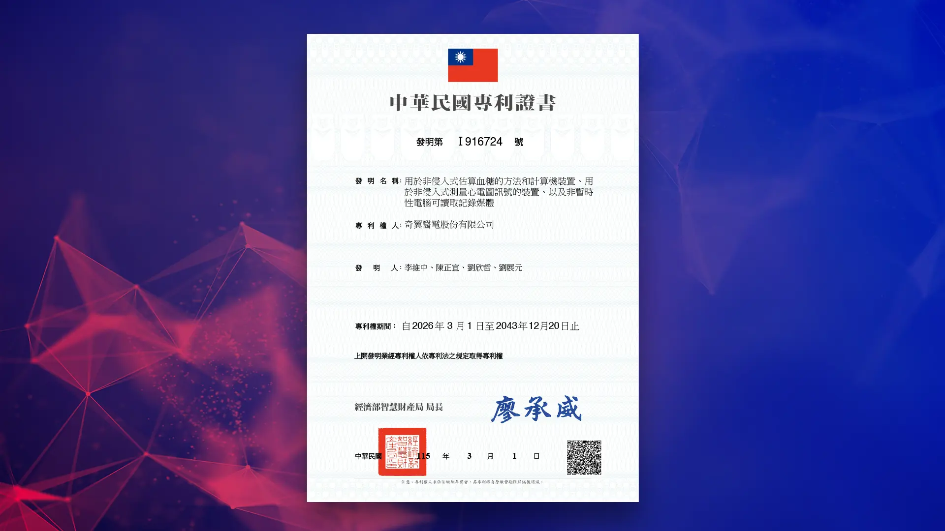本專利的取得不僅擴展了奇翼醫電的全球智慧財產布局,也再次體現我們致力於推動預防醫學與數位健康創新的承諾